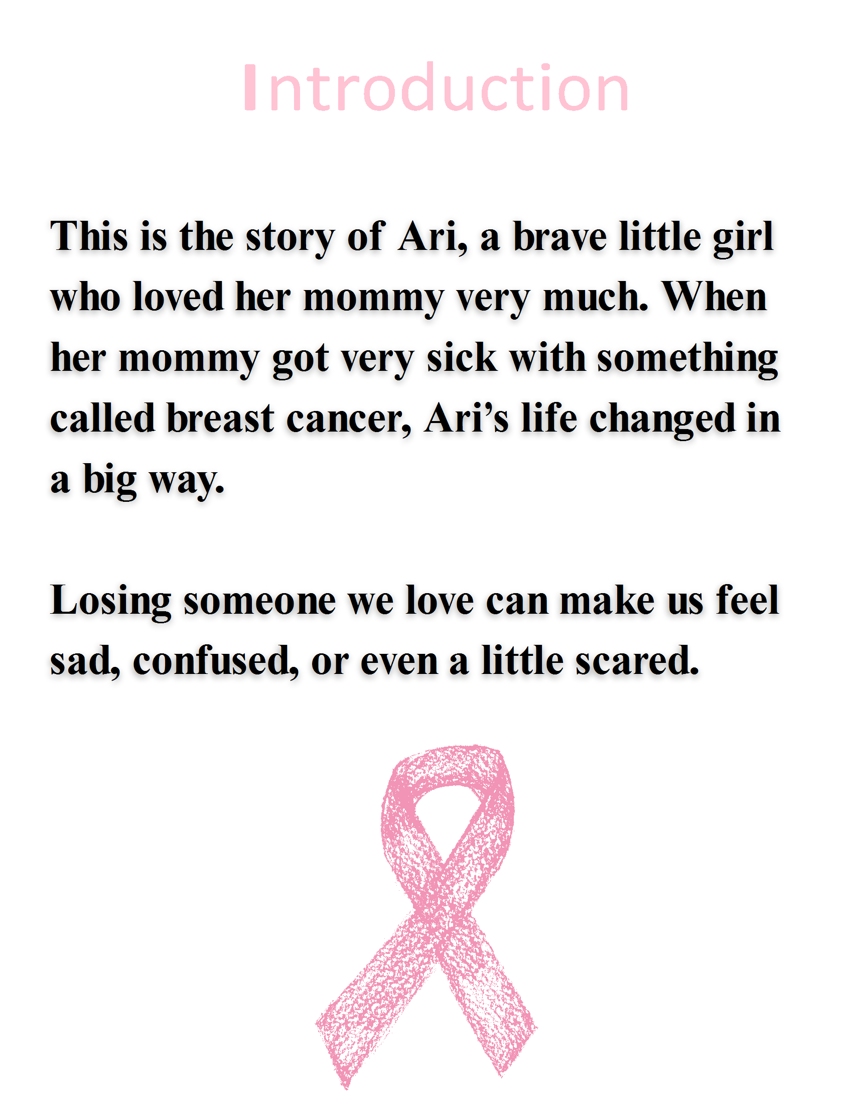 This is the story of Ari, a brave little girl who loved her mommy very much. When her mommy got very sick with something called breast cancer, Ari’s life changed in a big way. Losing someone we love can make us feel sad, confused, or even a little scared.