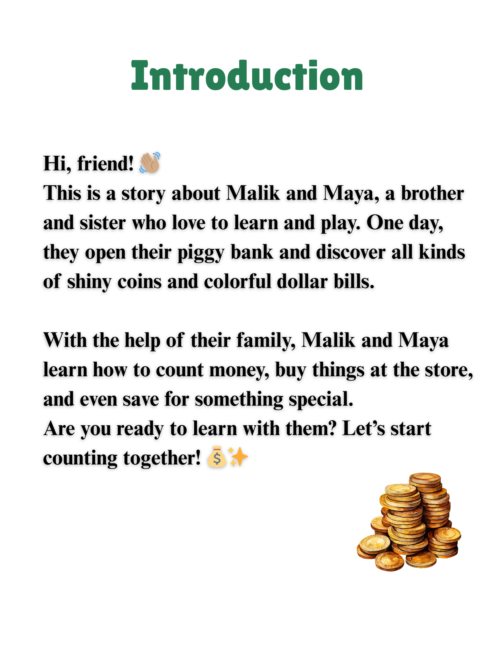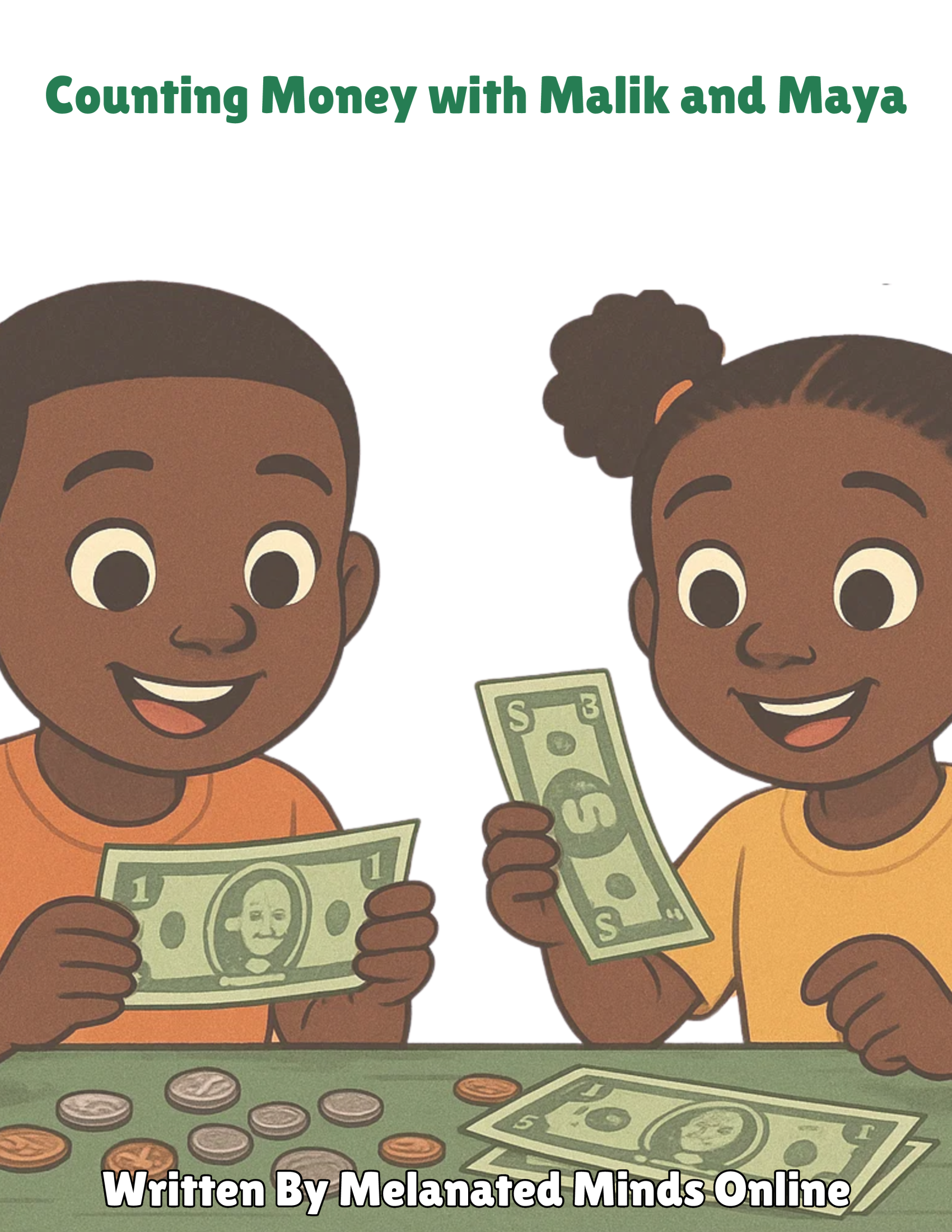 Introduce your child to the world of money with this fun and educational E-Book designed for kids in Pre-K through 5th grade. Counting Money with Malik and Maya follows two siblings as they discover how to identify coins, count bills, shop at the store, and save for something special.