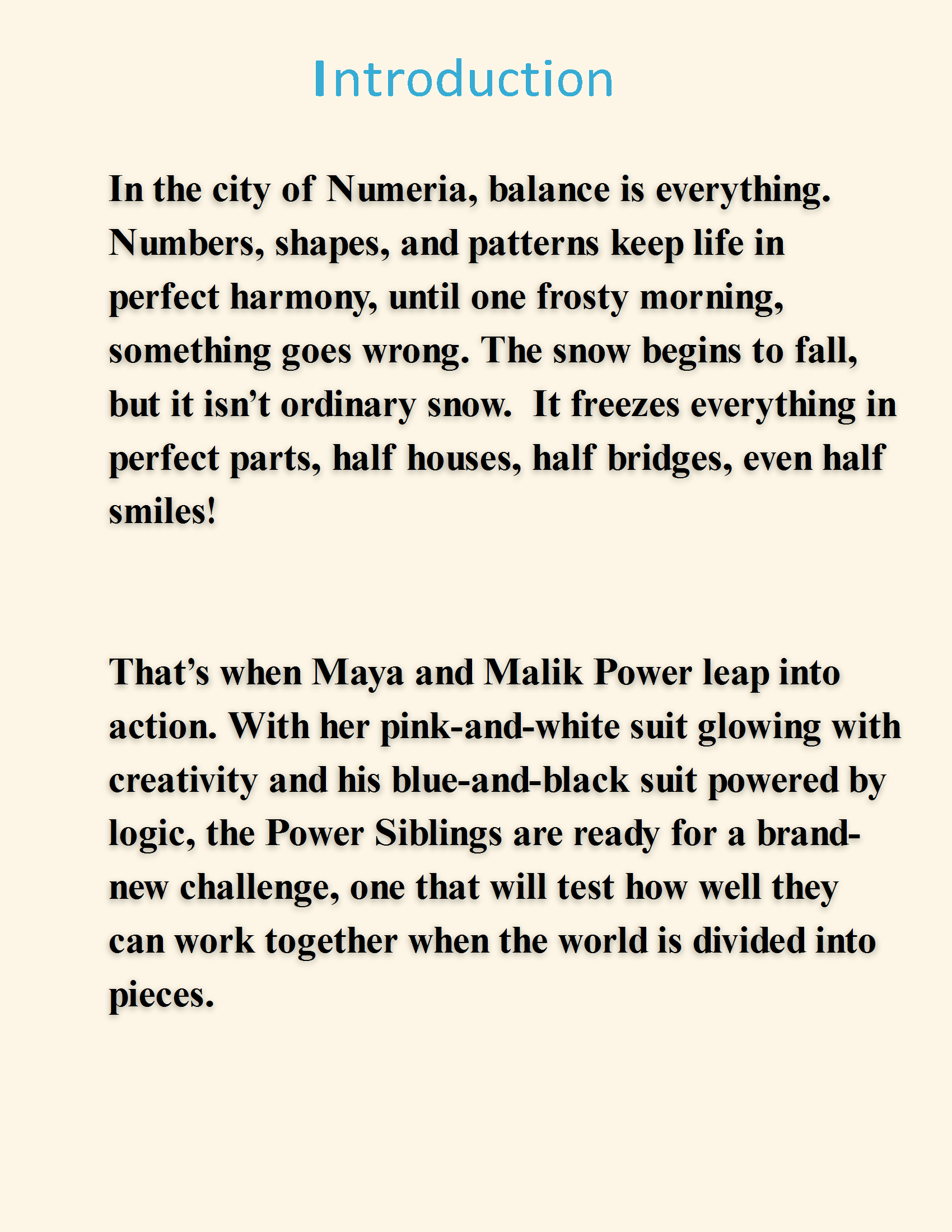 In the city of Numeria, balance is everything. Numbers, shapes, and patterns keep life in perfect harmony, until one frosty morning, something goes wrong. The snow begins to fall, but it isn’t ordinary snow. It freezes everything in perfect parts, half houses, half bridges, even half smiles!