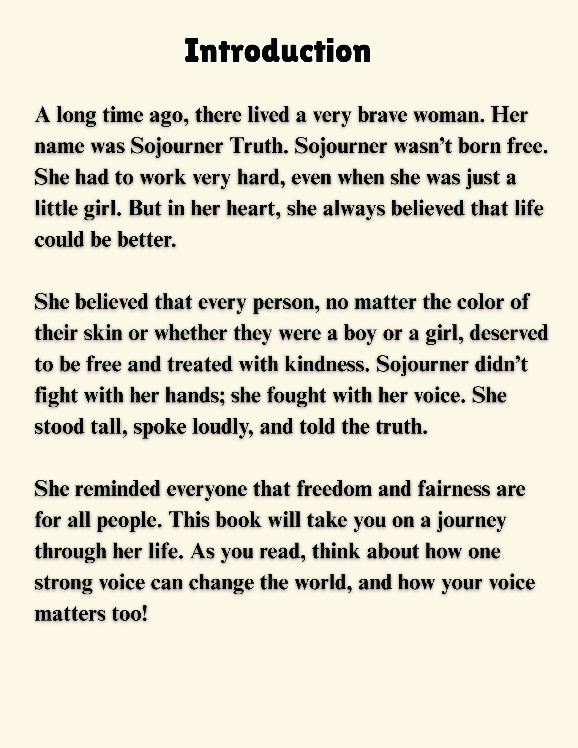 Sojourner Truth: The Little Girl Who Grew Into a Big Voice introduces young readers to one of history’s most courageous leaders. Written in simple, kid-friendly language with colorful illustration prompts, this book tells the inspiring story of Sojourner Truth, born as Isabella in 1797, who found her freedom, chose a powerful new name, and used her voice to speak out against slavery and for women’s rights.