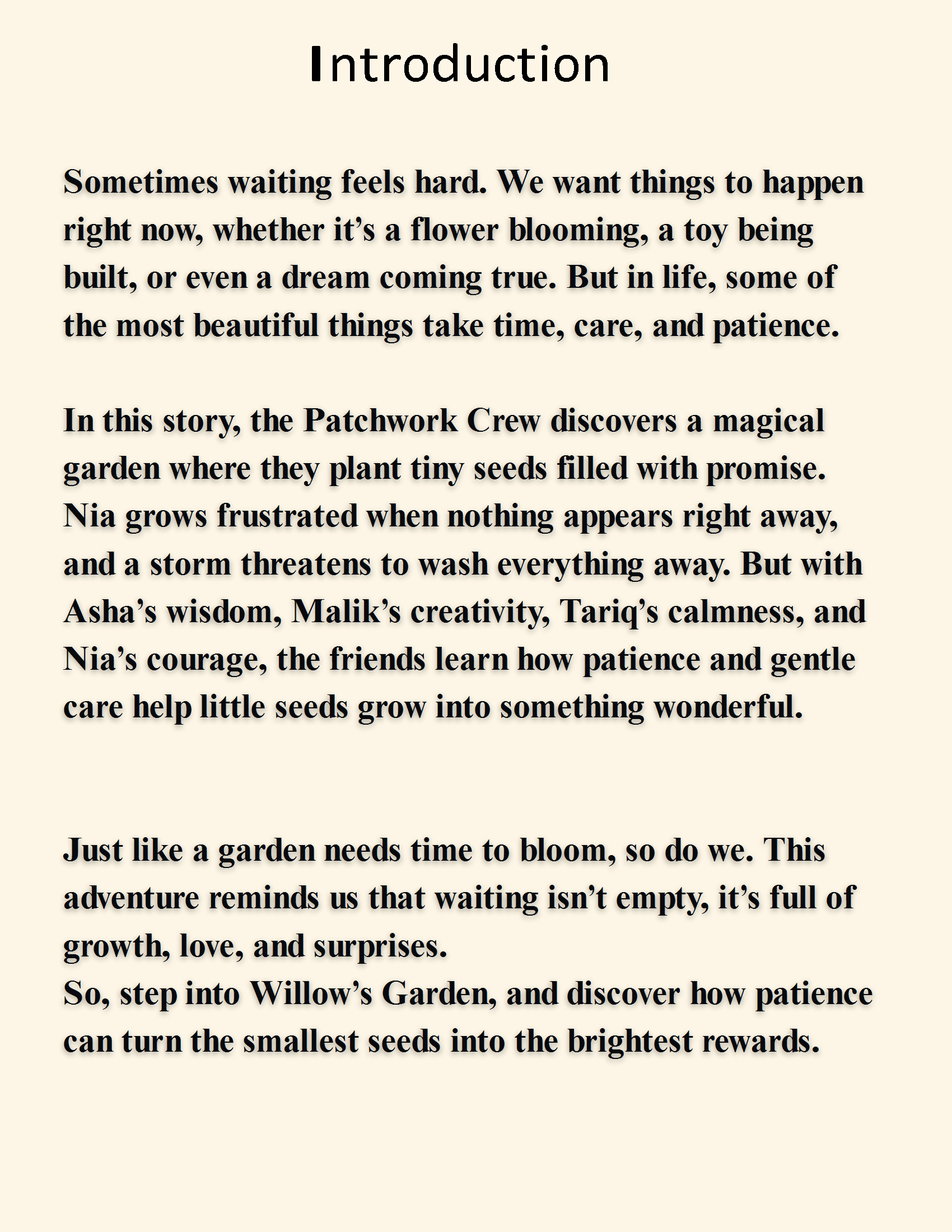In this story, the Patchwork Crew discovers a magical garden where they plant tiny seeds filled with promise. Nia grows frustrated when nothing appears right away, and a storm threatens to wash everything away. But with Asha’s wisdom, Malik’s creativity, Tariq’s calmness, and Nia’s courage, the friends learn how patience and gentle care help little seeds grow into something wonderful.